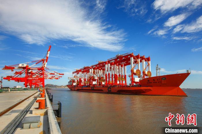 洋山四期自動(dòng)化碼頭,振華重工的岸橋、場(chǎng)橋、運(yùn)輸船?!≌袢A重工供圖