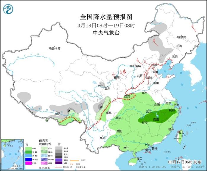 3月17日08時至18日08時,西藏東部、青海東北部和南部、甘肅南部、川西高原北部、內蒙古東北部、黑龍江東部、吉林東部等地部分地區(qū)有小到中雪或雨夾雪,其中,西藏東部、川西高原北部等地局部地區(qū)有大到暴雪(10~15毫米)。西藏東南部、西北地區(qū)東部、西南地區(qū)東部、黃淮西部、江淮中西部、江漢、江南、華南北部等地部分地區(qū)有小到中雨,其中,湖南北部等地部分地區(qū)有大雨(25~30毫米)。內蒙古中西部、黑龍江東部、遼寧中北部、遼東半島、山東半島、江蘇中部、四川盆地中部等地部分地區(qū)有4~6級風。