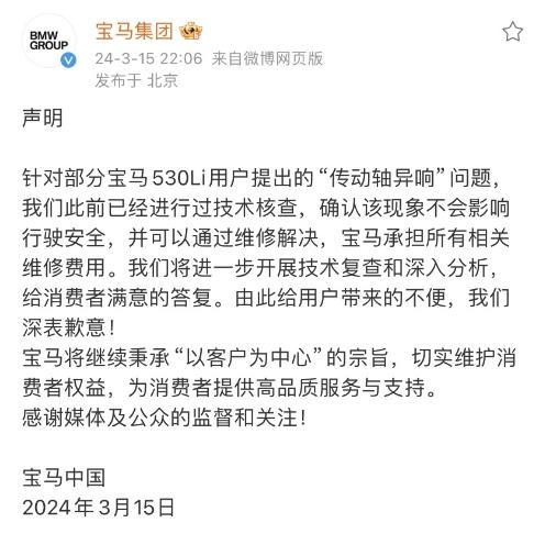 當晚,寶馬集團也發(fā)布聲明稱,“針對部分寶馬530Li用戶提出的‘傳動軸異響’問題,我們此前已經(jīng)進行過技術(shù)核查,確認該現(xiàn)象不會影響行駛安全,并可以通過維修解決,寶馬承擔所有相關(guān)維修費用。我們將進一步開展技術(shù)復(fù)查和深入分析,給消費者滿意的答復(fù)。由此給用戶帶來的不便,我們深表歉意!”