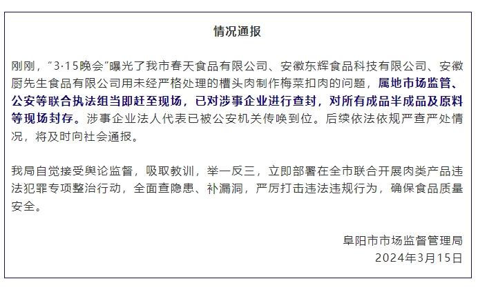 涉事企業(yè)所在的阜陽市市場監(jiān)督管理局當晚發(fā)布情況通報稱,屬地市場監(jiān)管、公安等聯(lián)合執(zhí)法組當即趕至現(xiàn)場,已對涉事企業(yè)進行查封,對所有成品半成品及原料等現(xiàn)場封存。涉事企業(yè)法人代表已被公安機關(guān)傳喚到位。后續(xù)依法依規(guī)嚴查嚴處情況,將及時向社會通報。
