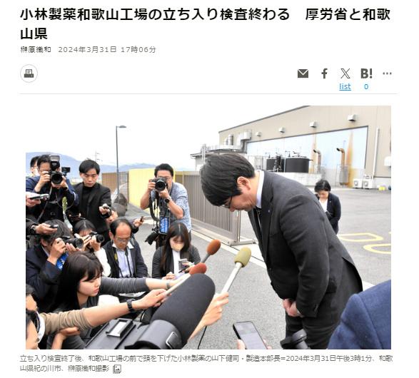 當(dāng)天上午,日本厚生勞動省及和歌山縣政府相關(guān)部門共計17名工作人員,開始對小林制藥公司在和歌山縣的工廠進(jìn)行檢查。