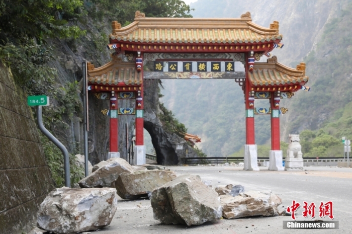 圖為位于太魯閣公園的中橫公路入口,立霧溪出??趦蓚?cè)山體有明顯滑坡痕跡?!皷|西橫貫公路”牌樓前,靠山體一側(cè)道路落滿大石。中新社記者 楊程晨 攝