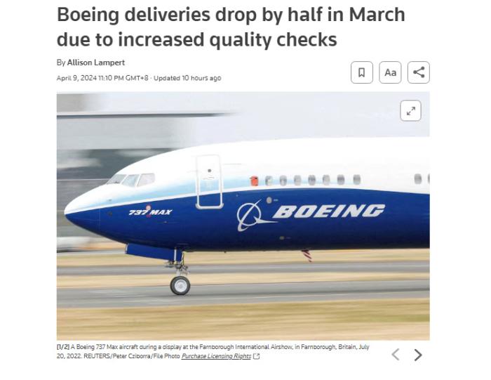 外媒:嚴(yán)格審查下 波音第一季度新機(jī)交付數(shù)不足百架