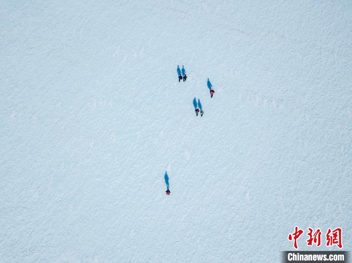 藍(lán)冰上的科學(xué)家、野外向?qū)Ш陀浾?。照片攝于智利南極研究所(INACH)2022年對(duì)南極洲埃爾斯沃斯山脈聯(lián)合冰川的實(shí)地考察(圖片來(lái)自智利圣地亞哥大學(xué)Jose Jorquera)。施普林格·自然/供圖