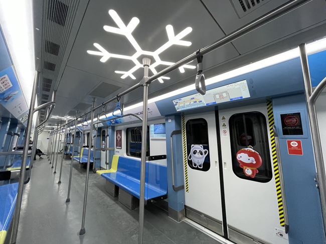 登上車廂,隨處可見冬奧元素。車頂?shù)臒魩Р辉賳握{(diào),而是被設計成了雪花的形狀,車廂扶手也融入了冰球桿的設計。而在車門上,北京冬奧會吉祥物“冰墩墩”和“雪容融”仿佛在和乘客們招手。