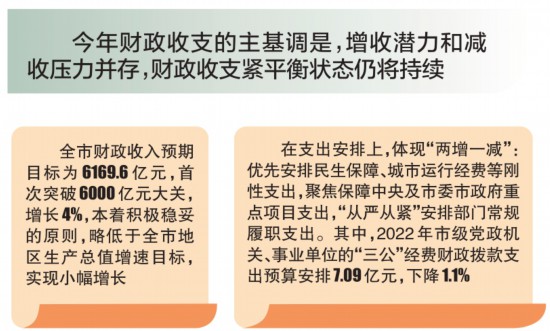 在財政收支依然嚴峻的情況下,“緊平衡”態(tài)勢也呈現(xiàn)出與以往財政收入零增長、負增長不同的態(tài)勢。吳素芳介紹,2022年的“緊平衡”,主要體現(xiàn)為收入回歸常態(tài)運行,但各領域資金需求快速增長。財政部門要堅決貫徹落實中央經(jīng)濟工作會提出的“積極的財政政策要提升效能,更加注重精準、可持續(xù)”工作要求,通過調結構、盤存量、抓統(tǒng)籌、保重點等方式做好保障。在支出安排上,體現(xiàn)“兩增一減”:優(yōu)先安排民生保障、城市運行經(jīng)費等剛性支出,聚焦保障中央及市委市政府重點項目支出,“從嚴從緊”安排部門常規(guī)履職支出。其中,2022年市級黨政機關、事業(yè)單位的“三公”經(jīng)費財政撥款支出預算安排7.09億元,下降1.1%。