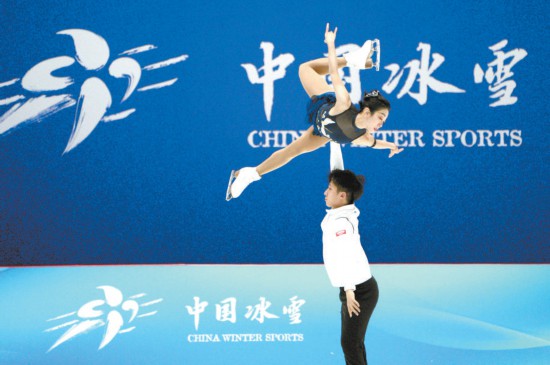 中國花樣滑冰運動員隋文靜和韓聰在訓練中。本報記者 劉平攝