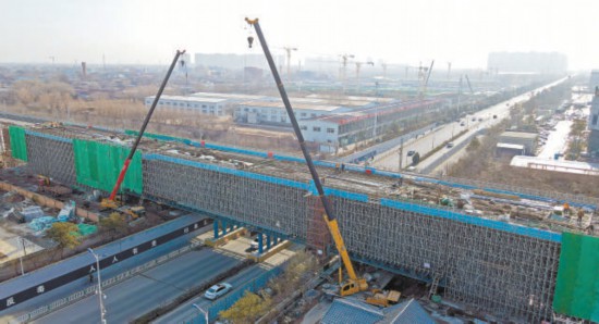 京唐城際鐵路燕郊段跨思菩蘭路連續(xù)梁建設現(xiàn)場。 河北日報記者 趙永輝攝