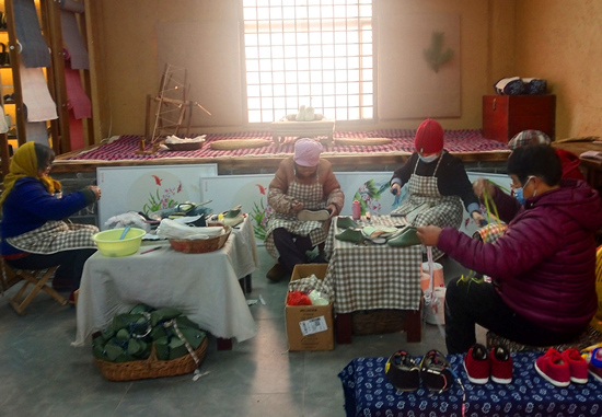 北莊團(tuán)結(jié)手工坊工人在納鞋底。 實習(xí)生 駱金瑾攝