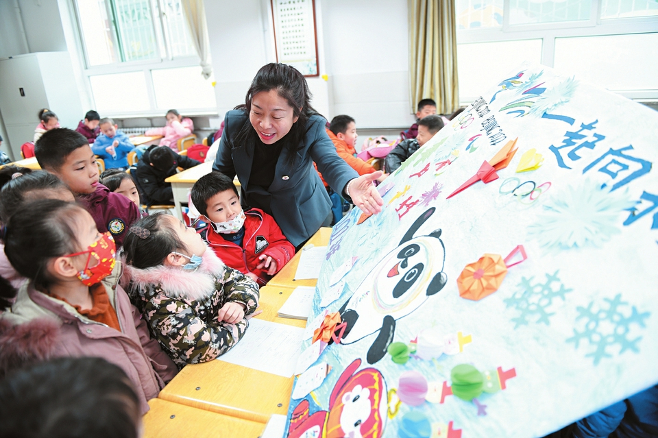 1月6日,太原市第二實驗小學(xué),孩子們在與老師的互動中學(xué)習(xí)知識。該校積極響應(yīng)“雙減”政策,為一、二年級學(xué)生開展“巧娃迎冬奧”等主題綜合素質(zhì)大比拼,讓孩子們在動手、動腦、小組合作中輕松快樂地開展自主、合作、探究性學(xué)習(xí)。(記者阮洋攝)