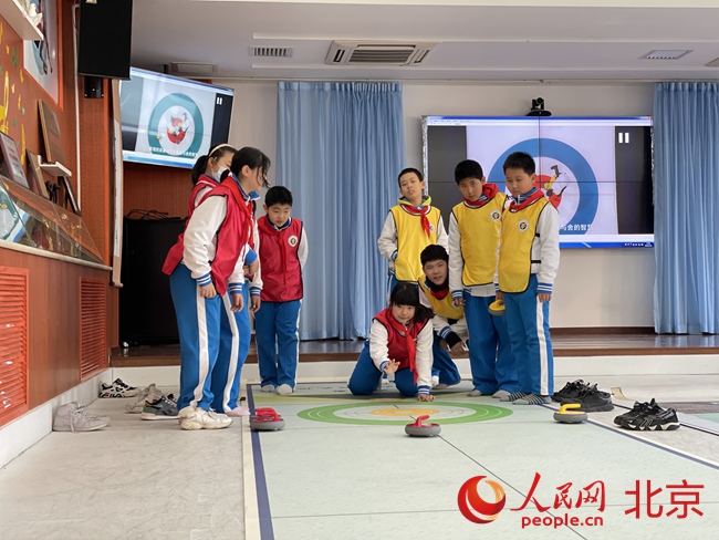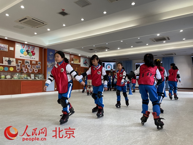 海淀首個小學(xué)“冰雪教室”亮相,可進(jìn)行冰壺、短道速滑等項目。人民網(wǎng) 董兆瑞攝