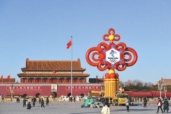 昨天,天安門廣場又添新景。一個鑲嵌有2022冬奧會會徽的巨型中國結(jié)正在安裝。中國結(jié)整體呈紅色,中心鑲嵌一片藍白相間的雪花,雪花正中是2022冬奧會會徽,為迎接春節(jié)和冬奧營造喜慶氛圍。 本報記者 鄧偉攝