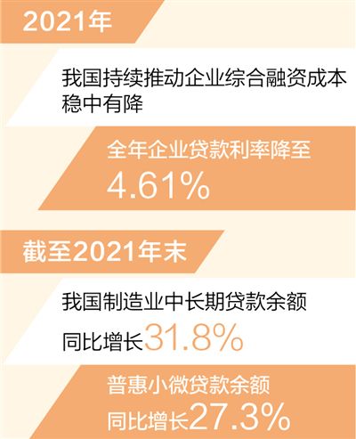 本報(bào)北京1月18日電?。ㄓ浾邊乔镉啵┲袊?guó)人民銀行發(fā)布的最新數(shù)據(jù)顯示,2021年我國(guó)持續(xù)推動(dòng)企業(yè)綜合融資成本穩(wěn)中有降,全年企業(yè)貸款利率降至4.61%,比2020年下降0.1個(gè)百分點(diǎn),比2019年下降0.69個(gè)百分點(diǎn),是改革開(kāi)放40多年來(lái)最低水平。