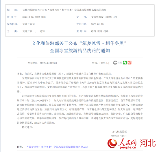 人民網石家莊1月19日電 (商帆)近日,文化和旅游部發(fā)布了“筑夢冰雪·相伴冬奧”全國冰雪旅游精品線路,10條線路涵蓋北京、河北、黑龍江、吉林、遼寧、新疆、內蒙古7個北方冰雪旅游大?。▍^(qū)、市),以及甘肅、四川、湖北、重慶等近幾年冰雪旅游加快發(fā)展的地區(qū)。河北省“冰雪京張·冬奧之城”精品線路和“長城內外·冰雪絲帶”精品線路入選。