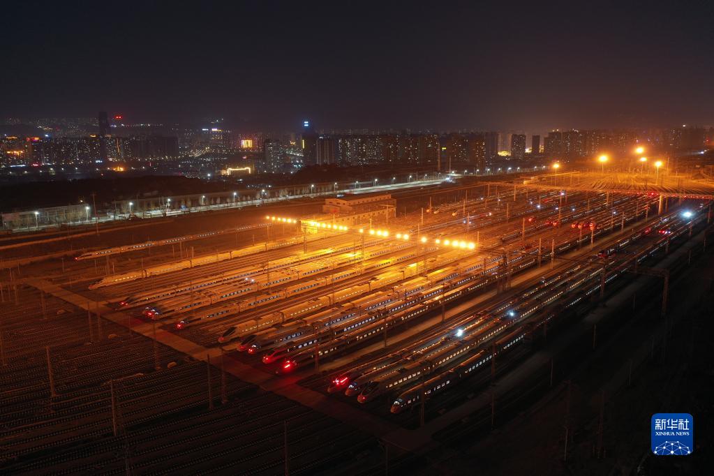 1月16日晚,動(dòng)車(chē)組列車(chē)停靠在中國(guó)鐵路蘭州局集團(tuán)有限公司蘭州車(chē)輛段蘭州西動(dòng)車(chē)運(yùn)用所整備場(chǎng)上,為1月17日開(kāi)始的2022年春運(yùn)做好準(zhǔn)備(無(wú)人機(jī)照片)。新華社記者 杜哲宇 攝