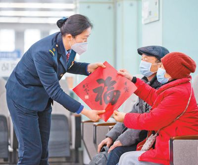 春運(yùn)期間,南京火車站從細(xì)節(jié)著手、小事出發(fā),推出了一系列溫馨服務(wù)?!?58”雷鋒服務(wù)站購置一批適合兒童使用的口罩,教孩子們?nèi)绾握_佩戴,同時(shí)為乘車旅客送上春聯(lián)、窗花或“?!弊帧D為“158”雷鋒服務(wù)站客運(yùn)值班員為旅客送上新春祝福。
