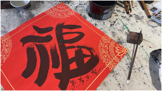 朱者赤是去年7月入駐藝術(shù)村的自由職業(yè)藝術(shù)家,今年,他決定留在林家村過年,他希望以送“?!钡姆绞絹肀磉_自己真摯的祝福,與村民們一起歡度春節(jié)。581幅各不相同的藝術(shù)“?!弊?,正是他送給村中581戶家庭的新年禮物?!叭腭v半年來,政府部門的關(guān)心幫助和支持與村民們熱情地問候讓我非常感動,我懷著感恩的心情,寫下這581個創(chuàng)意福字。”朱者赤說。