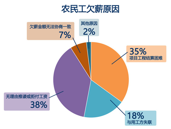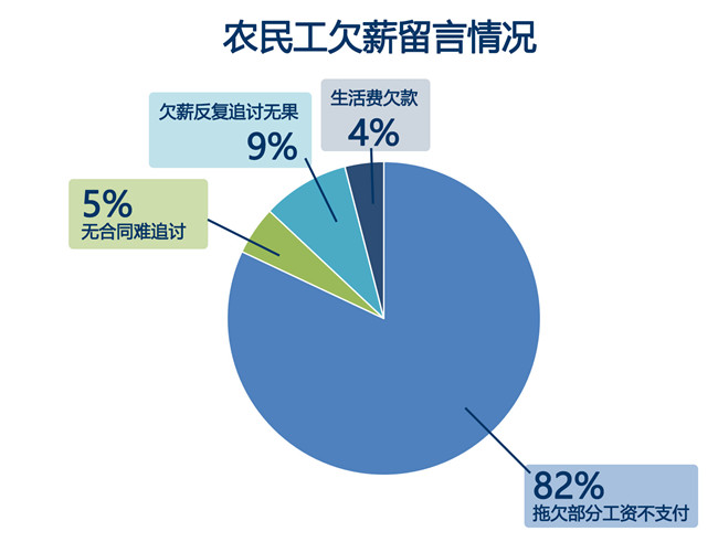 在群眾留言中,農(nóng)民工欠薪的情況大部分為薪資未全額支付,這類占留言總數(shù)的約82%;無(wú)勞動(dòng)合同、反復(fù)追討無(wú)果以及拖欠生活費(fèi)的情況也有發(fā)生。項(xiàng)目工程結(jié)算困難、用工方推諉則是導(dǎo)致欠薪的主要原因。