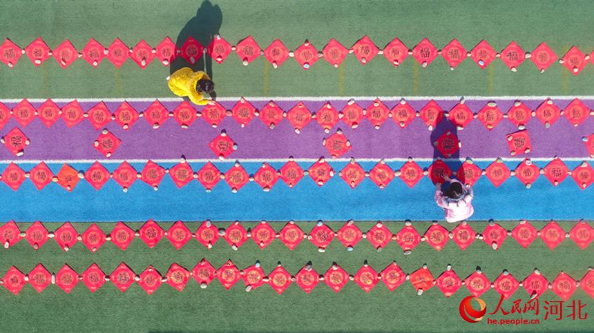 1月17日,河北省唐山市豐潤區(qū)泉河頭鎮(zhèn)羅文口小學(xué)學(xué)生在晾曬為村民書寫的“?!弊?。 朱大勇攝