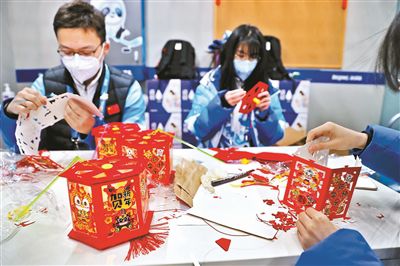 昨天是中國的傳統(tǒng)節(jié)日元宵佳節(jié),國家體育館開展了豐富多彩的慶祝活動,當天場館餐廳提供了湯圓,場館禮賓部工作人員向外賓介紹中國吃湯圓的由來和寓意,并邀請大家品嘗。在志愿者之家內,彩燈高懸,充滿歡聲笑語,志愿者們做燈籠、猜燈謎,共同度過一個歡樂祥和的元宵節(jié)。圖為冬奧志愿者在制作花燈。文并攝/本報記者 黑建軍