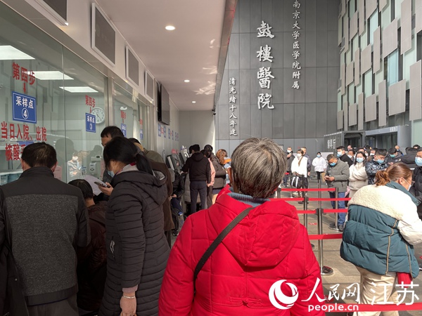 由于檢測(cè)人數(shù)較多,南京鼓樓醫(yī)院的核酸檢測(cè)隊(duì)伍存在一米間距不足的問題。人民網(wǎng) 馬曉波攝