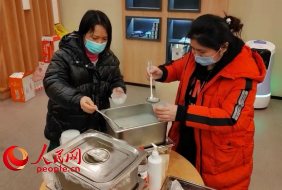 元宵節(jié)當天,蘇州市吳中區(qū)郭巷街道湖景花園社區(qū)為隔離人員送上熱氣騰騰的湯圓。沈君攝