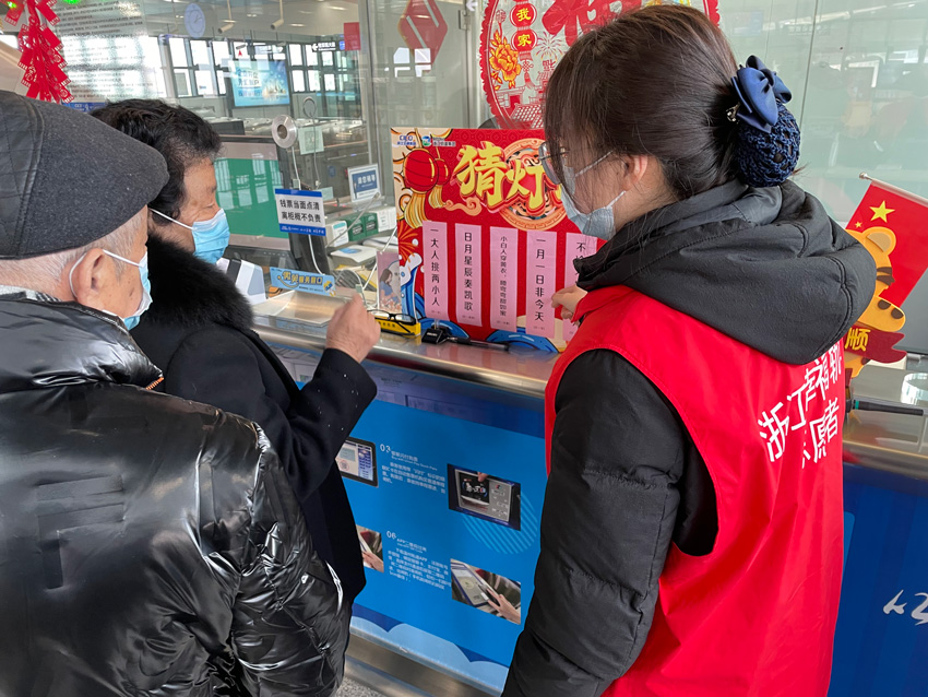 在各車站的客服中心外的燈謎展板上貼滿了各式各樣的燈謎,乘客們停下腳步,在工作人員的指引下猜起燈謎。