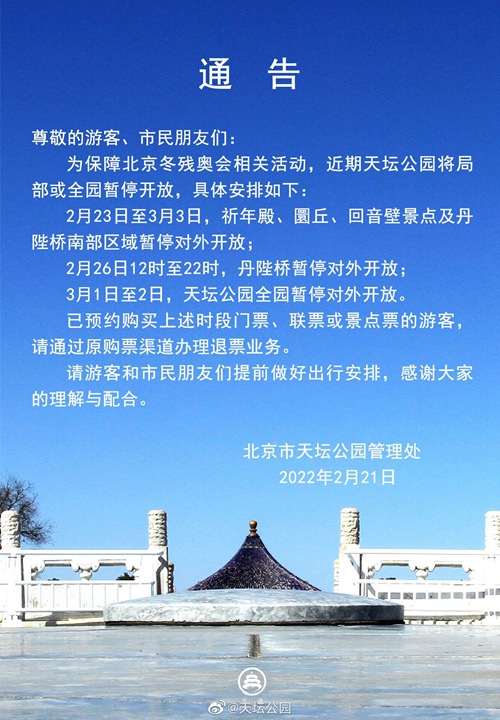 人民網(wǎng)北京2月22日電 2月21日,天壇公園管理處發(fā)布通告稱,為保障北京冬殘奧會(huì)相關(guān)活動(dòng),近期天壇公園將局部或全園暫停開放。