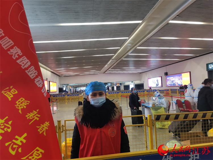 在蘇州火車站參與志愿服務的熱心市民何群飛。人民網(wǎng)記者 王繼亮攝
