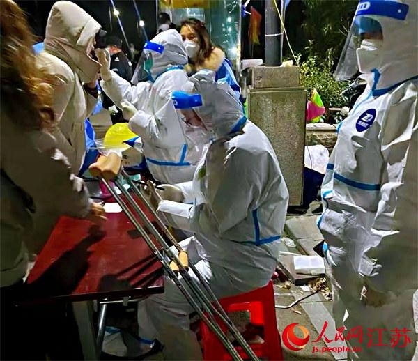 從16日晚上開始,蘇州市第九人民醫(yī)院醫(yī)生白志余拄著拐杖的照片在朋友圈刷屏。“請大家排隊時務(wù)必戴好口罩、保持防護(hù)距離、提前展示健康碼、降低感染風(fēng)險......”他連夜加入核酸檢測志愿者隊伍中,拄著雙拐維持秩序,被居民們親切地稱為“拐杖醫(yī)生”。