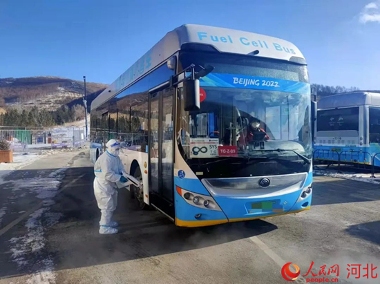 張家口賽區(qū)運(yùn)行保障團(tuán)隊工作人員在對車輛進(jìn)行消毒工作。 譚磊攝