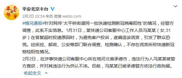 據(jù)北京豐臺(tái)公安分局官方微博消息,針對(duì)網(wǎng)上流傳“太平橋街道同一批快遞檢測(cè)新冠病毒陽(yáng)性”的情況,經(jīng)警方調(diào)查,此系不實(shí)信息。1月31日,某快遞公司客服中心工作人員馮某某(女,31歲)在答復(fù)超時(shí)投遞原因時(shí),為避免客戶投訴,遂編造該謊言,引發(fā)了群眾恐慌。經(jīng)疾控、郵政、公安等部門(mén)聯(lián)合調(diào)查、檢測(cè)確認(rèn),不存在謊言所稱快遞新冠物檢陽(yáng)性情況。