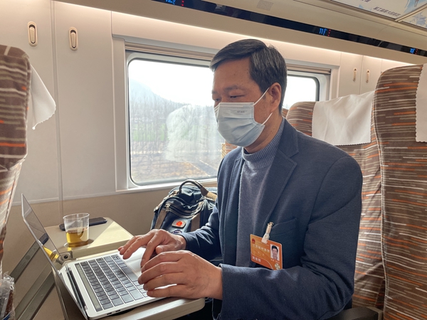 3月3日,赴京參會途中,全國人大代表佘才高、李鴻彬交流建議修改情況。鹿偉攝