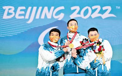 3月7日,北京冬殘奧會殘奧單板滑雪男子障礙追逐UL級比賽在云頂滑雪公園舉行,三位來自河北的“零零后”選手紀(jì)立家、王鵬耀、朱永鋼分獲金、銀、銅牌,取得了我國、河北省在冬殘奧會該項目的歷史性突破。當(dāng)晚該項目的頒獎儀式上,3面五星紅旗同時升起,激動人心。