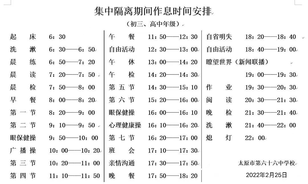 六十六中位于太原市尖草坪區(qū)迎新街迎新東二條,有兩棟教學(xué)樓,分別為初中部與高中部,是一所完全中學(xué)。為了最大程度保證正常教學(xué)秩序,學(xué)校在當(dāng)天就開始制定作息時間表,根據(jù)學(xué)生不同年齡段的特點(diǎn),分年級安排部署了隔離期間師生的學(xué)習(xí)與生活。