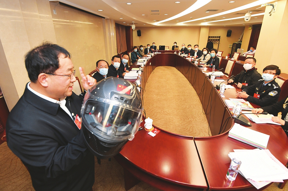 3月7日,山西代表團舉行小組會議。呂春祥代表對政府工作報告提出的“今年深入實施創(chuàng)新驅(qū)動發(fā)展戰(zhàn)略”深感振奮,對“推進科技創(chuàng)新,促進產(chǎn)業(yè)優(yōu)化升級,突破供給約束堵點,依靠創(chuàng)新提高發(fā)展質(zhì)量”充滿信心。他展示了其所在的中科院山西煤化所和山西鋼科碳材料有限公司碳纖維聯(lián)合團隊研發(fā)的TG800碳纖維材料,這一材料應(yīng)用于雪車頭盔,成為今年北京冬奧會上亮眼的山西名片。(記者李聯(lián)軍攝)