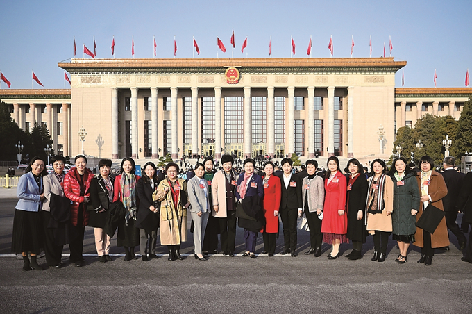 3月8日上午,出席十三屆全國人大五次會議的江蘇團(tuán)女代表在人民大會堂前合影留念,共慶“三八”國際勞動(dòng)?jì)D女節(jié)。 本報(bào)記者 吳勝 攝