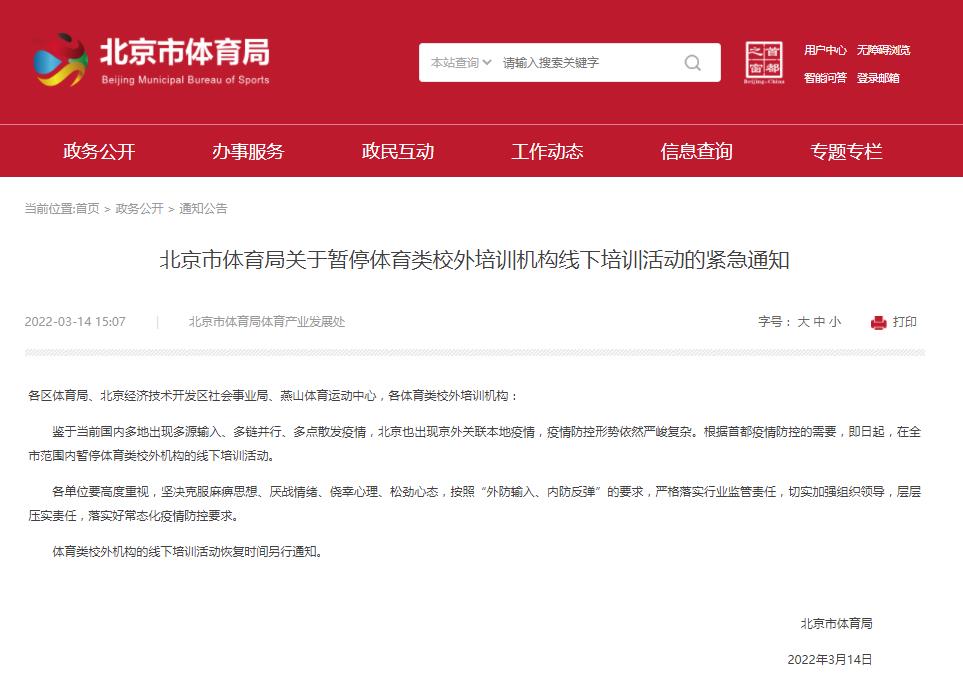 北京:全市范圍內暫停體育類校外機構的線下培訓活動