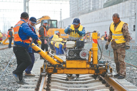 昨天上午,豐臺(tái)站改建工程計(jì)算機(jī)聯(lián)鎖封鎖施工、撥線施工開(kāi)始,七百余名施工人員同時(shí)作業(yè)保障工程順利完成。本報(bào)記者 安旭東攝