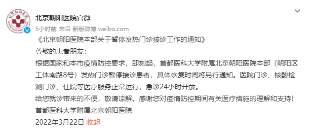 北京朝陽(yáng)醫(yī)院本部發(fā)熱門診暫停接診患者