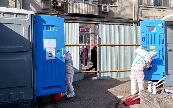 剛封閉不久,北新橋街道后永康胡同東口便增加了2座臨時(shí)單坑的移動公廁,為后永康胡同1號院、11號院隔離居民和防疫人員提供服務(wù);民旺社區(qū)周邊胡同連夜搭建了12座單坑臨時(shí)移動公廁,在民旺南胡同為底商設(shè)置2座單坑臨時(shí)移動公廁;在北新橋育樹胡同周邊,11座移動公廁也安裝完成。
