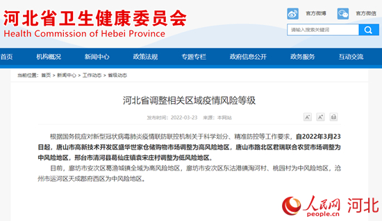 人民網石家莊3月23日電 據河北省衛(wèi)健委發(fā)布的最新消息,根據國務院應對新型冠狀病毒肺炎疫情聯(lián)防聯(lián)控機制關于科學劃分、精準防控等工作要求,自2022年3月23日起,唐山市高新技術開發(fā)區(qū)盛華世家倉儲購物市場調整為高風險地區(qū),唐山市路北區(qū)君瑞聯(lián)合農貿市場調整為中風險地區(qū),邢臺市清河縣葛仙莊鎮(zhèn)袁宋莊村調整為低風險地區(qū)。