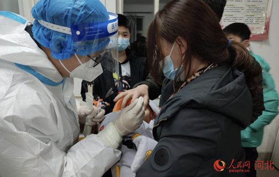 3月18日,海興縣小山鄉(xiāng)9個(gè)月大的寶寶被媽媽抱著接受核酸檢測。 梁妍婧攝