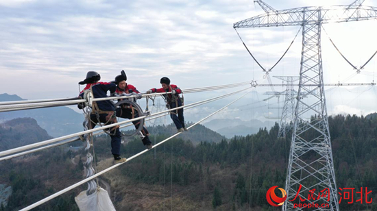 河北送變電公司高空作業(yè)人員認真開展架線施工。 王學恩攝