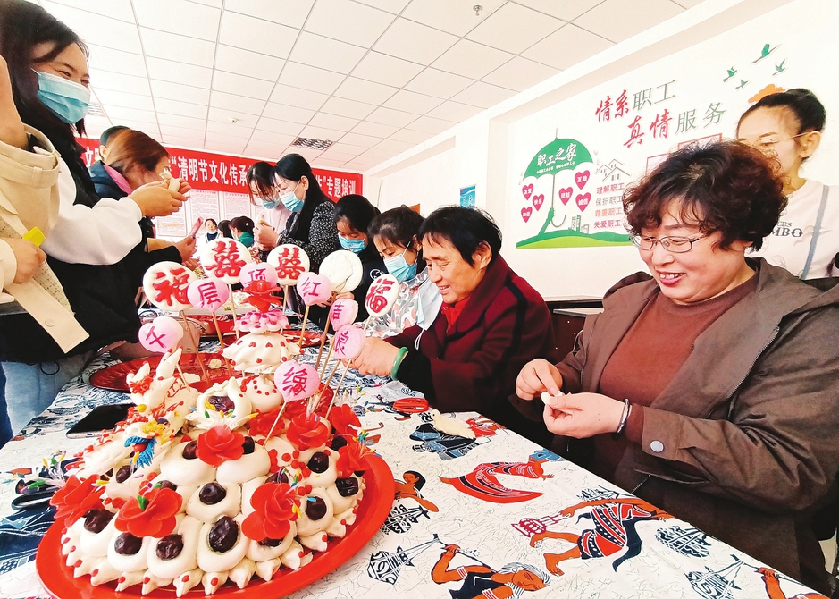 三月二十七日,石樓縣新時代文明實踐中心開展“清明節(jié)文化傳承教育和傳統(tǒng)美食制作”專題培訓(xùn),邀請“面花”手藝人現(xiàn)場教授捏面燕,倡導(dǎo)移風(fēng)易俗、文明祭祀。(李晶晶攝)