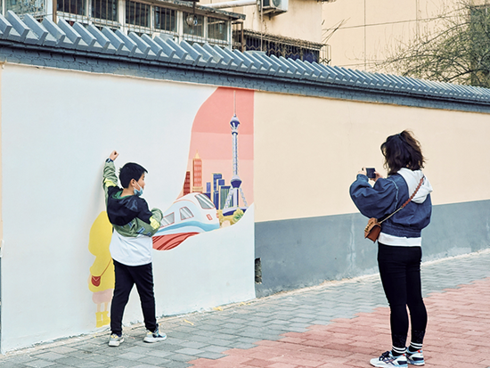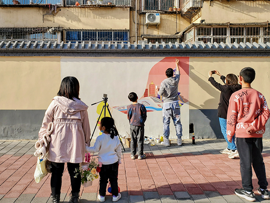 四歲的熱心市民“可樂”看著正在進行墻體繪畫的工作人員贊嘆道,“可樂”的媽媽在旁邊開心地笑著。