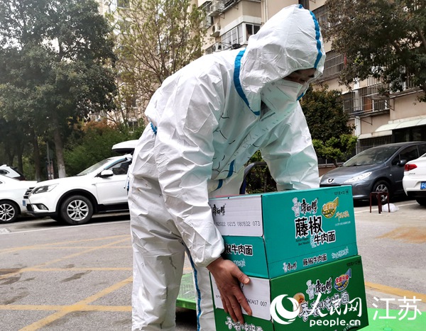 出不去的“外賣大哥”朱運東幫著搬運物資。受訪者供圖