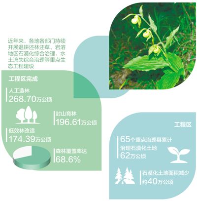 近年來,各地各部門持續(xù)開展退耕還林還草、巖溶地區(qū)石漠化綜合治理、水土流失綜合治理等重點(diǎn)生態(tài)工程建設(shè)。據(jù)統(tǒng)計,工程區(qū)完成人工造林268.70萬公頃、封山育林196.61萬公頃、低效林改造174.39萬公頃,森林覆蓋率達(dá)68.6%;工程區(qū)65個重點(diǎn)治理縣累計治理石漠化土地62萬公頃,石漠化土地面積減少約40萬公頃。
