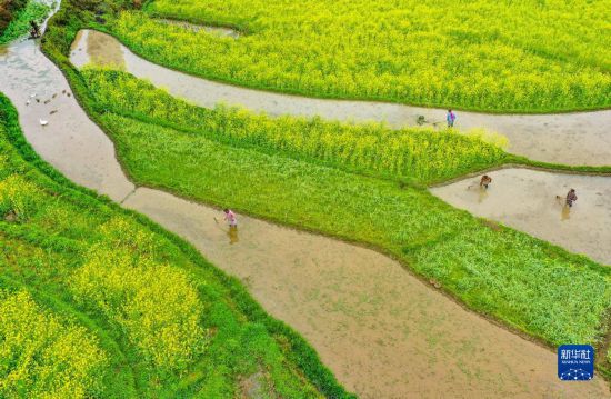 3月30日,貴州省銅仁市玉屏侗族自治縣亞魚鄉(xiāng)郭家灣村的農(nóng)民在田間勞作(無人機照片)。