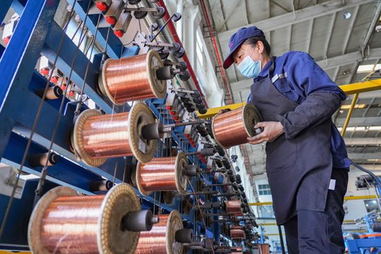 在河北省唐山市豐南區(qū)一家線纜制造企業(yè)生產(chǎn)車間內(nèi),機器設(shè)備正常運行,工人在崗位有序生產(chǎn)。 李福政攝